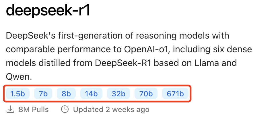 目前deepseek-r1模型大小提供了7个选择:1.5b、7b、8b、14b、32b、70b、671b。