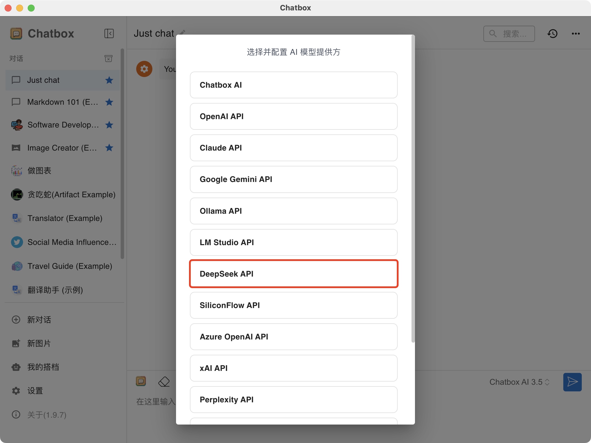 注意,这里我故意选错成DeepSeek API,这也是初学者经常会选错的,实际上,若选择这个你就找不到你本地的DeepSeek模型。