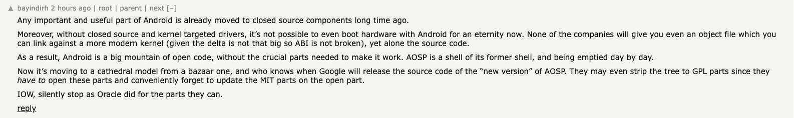 AOSP 之前是基于 Apache 2.0 许可证发行,尽管谷歌也表示会继续 release 源代码,且一再强调这并非闭源,但对于谷歌将开发转为 private 的行为,有网友评论说,“如果一个项目依赖于一家公司进行持续开发,那么开源许可证就没有任何意义。”