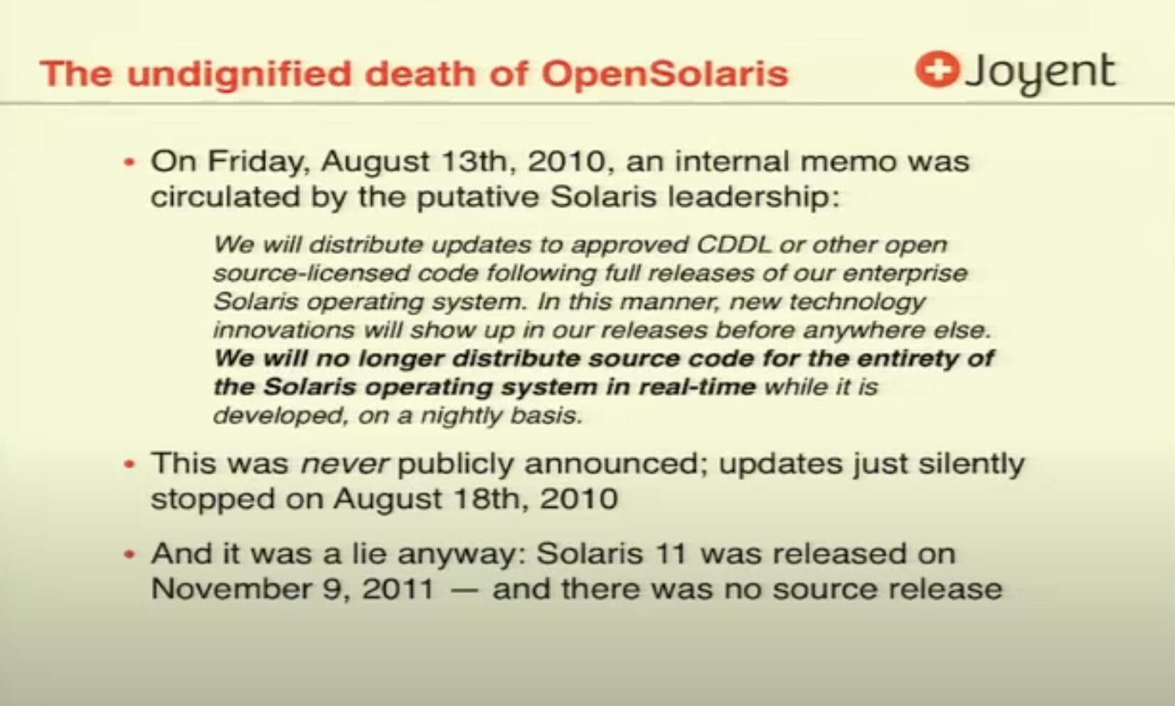 当时,OpenSolaris 也是宣布“我们将不再实时发布整个 Solaris 操作系统的源代码”。 但从那一刻起,源代码就再也没有公开过。
