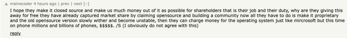 我希望他们干脆把 Android 变成闭源,并尽可能地为股东赚钱——毕竟,这才是他们的职责。他们为什么还要免费提供这个系统?他们已经通过宣称开源、建立社区成功占领了市场,现在只需要让它变成专有软件,而旧的开源版本会逐渐衰落、变得不稳定。然后,他们就可以像微软那样,对操作系统收费——但这次是在手机上,对数百万、甚至数十亿台设备收费,$。(显然我并不认同这种做法)。
