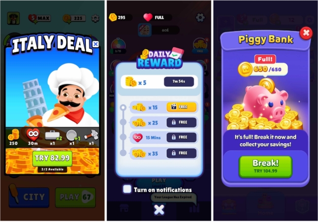 变现方面,混合休闲解谜游戏采用了休闲游戏和超休闲游戏的混合策略。内购促销的结构与传统休闲游戏类似,游戏内商店提供游戏币或特殊物品捆绑包。不同游戏对内购变现的关注点有所不同,有些游戏紧跟休闲解谜游戏的策略,定期推出限时促销和季票,而有些游戏则更注重激励广告和“移除广告”促销。