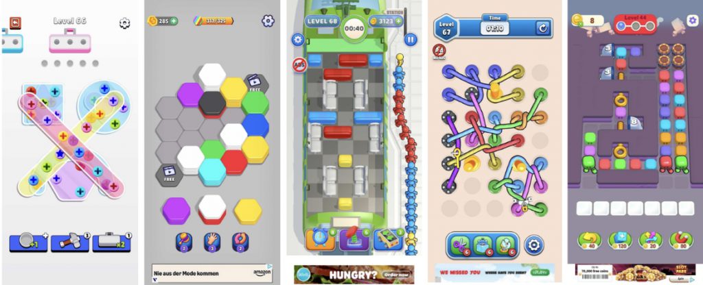 5 种不同的混合休闲解谜游戏(《Screw Jam》、《Hexa Sort》、《Seat Away》、《Twisted Tangle》和《Block Jam 3D》),具有 5 种不同的核心机制。