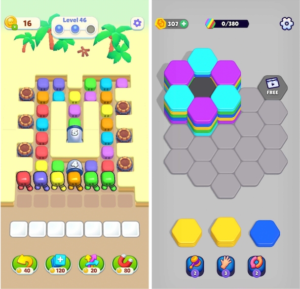 《Block Jam 3D》(左)和《Hexa Sort》(右)为其游戏玩法添加了随机性。
