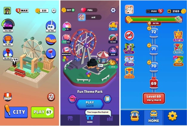 《Screw Jam》(左)、《Hexa Sort》(中)和《Seat Away》(右)的主屏幕上显示了各自的各种运营活动和促销。