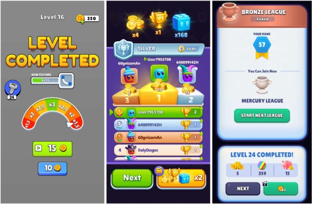 《Screw Jam》(左)、《Block Jam 3D》(中)和《Hexa Sort》(右)使用了游戏结束时的奖励广告。