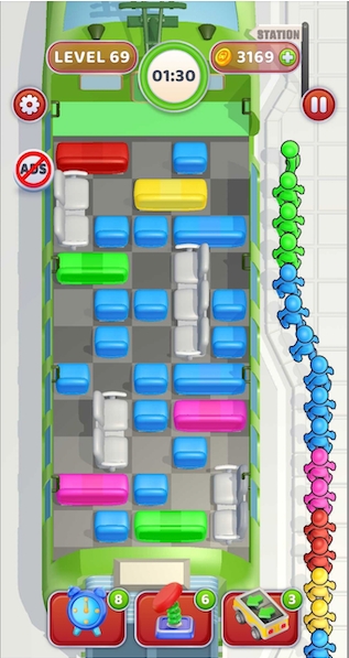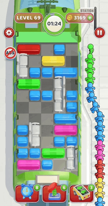 有些游戏通过策略性地使用游戏的屏幕空间来增加提示,同时仍要求玩家随时做出适应,从而解决了上文提到过的确定性问题。Rollic 的《Seat Away》就是一个很好的例子,它展示了一行接下来要使用的关卡物品。这种设计可以让人们快速了解接下来会发生什么,但玩家仍然需要根据实时决策调整策略,以应对关卡的进展。这种方法为玩家提供了足够的信息来提前计划,同时确保游戏玩法仍然具有挑战性和流畅性。