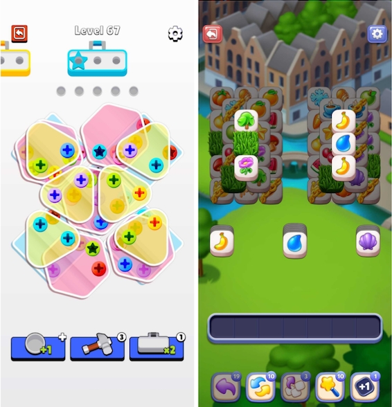 《Screw Jam》(左)并不像《Tile Busters》(右)那样将物品堆叠在一起,而是在各层之间使用半透明玻璃,让物品看起来不那么确定。