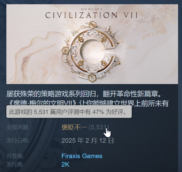 GameLook 报道/游戏圈“首发翻车大作”的行列,最近又新添了一员——4X 类游戏的鼻祖系列最新作《文明7》最近面向预购玩家抢先开放了游玩资格,却面临了一场 Steam 好评率不足 50% 的滑铁卢。虽然许多系列老玩家都知道,《文明》系列最近几作都是依靠后续的 DLC 在长线填充内容,但是首发糟糕的 UI 表现、频繁的闪退和不足的内容量还是让不少预购了豪华版玩家“强势破防”。