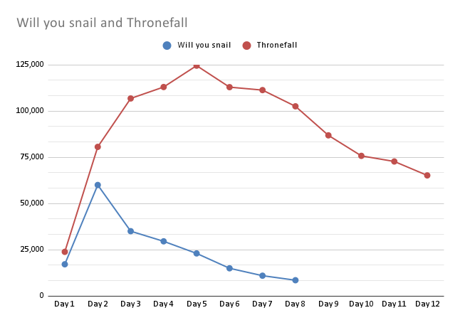 Jonas:可能由于 YouTube 频道的原因,《Will You Snail?》在生命周期的早期获得了格外高的热度和愿望单数量。