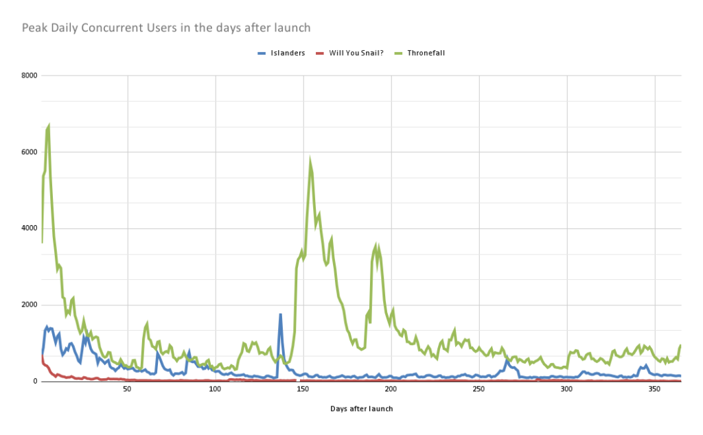 没错,《Thronefall》的流量远超另外两款游戏。但如果你仔细观察红色的《Will You Snail?》曲线,你会发现流量迅速下降,且没有发布后峰值。而《ISLANDERS》和《Thronefall》在发布几周后都经历了销售高峰。