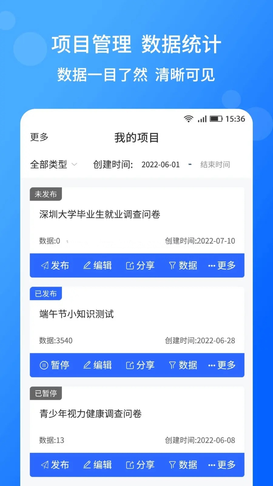 2. 强大的项目管理功能,可以方便地管理自己的问卷项目,随时查看进度和结果。